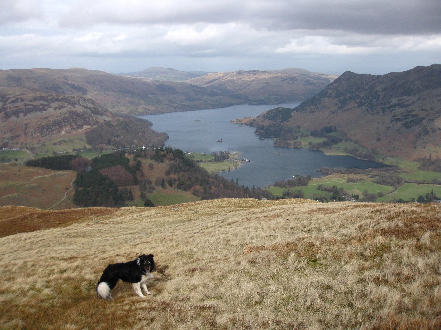 It was a grey day. We kept to the left of the wall of Glamara Deer Park and would follow it practically all the way to Birks summit. Arnison Crag Summit view down Ullswater.