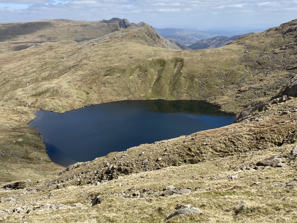 View down to Three Tarns and the route to Crinkle Crags.