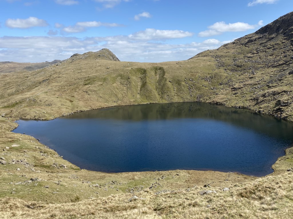We head down towards Angle Tarn. Rossett Pike above it.