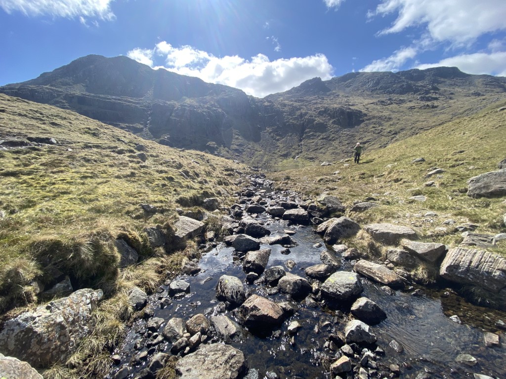 Approaching Ore Gap with Esk Pike ahead. The terrain is very rocky.
