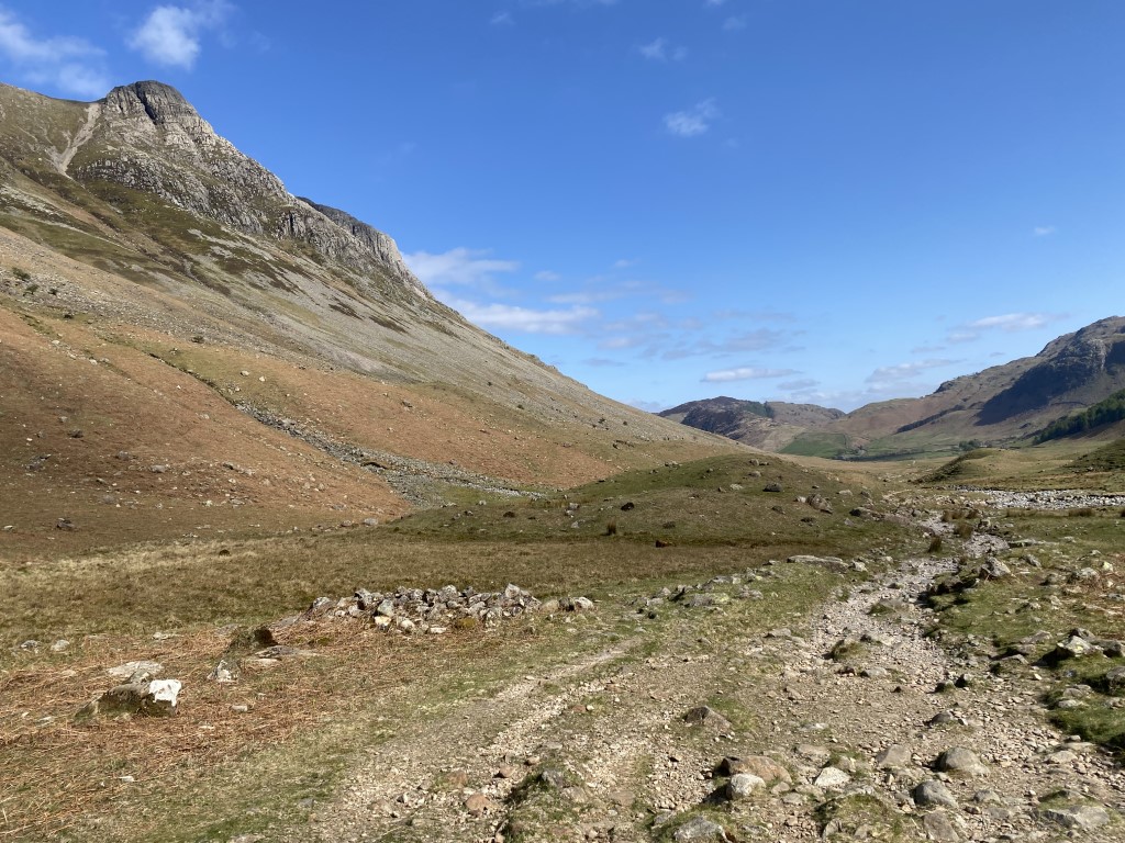 Bowfell Butress on the left and the view down Mickleden.