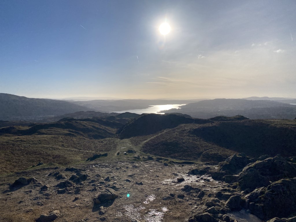 View back with Loughrigg Tarn on the left and Elterwater on the right.