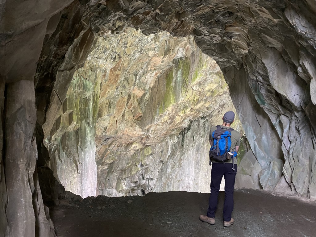 We turn left for a detour up to Cathedral Quarry Cave. The route in.