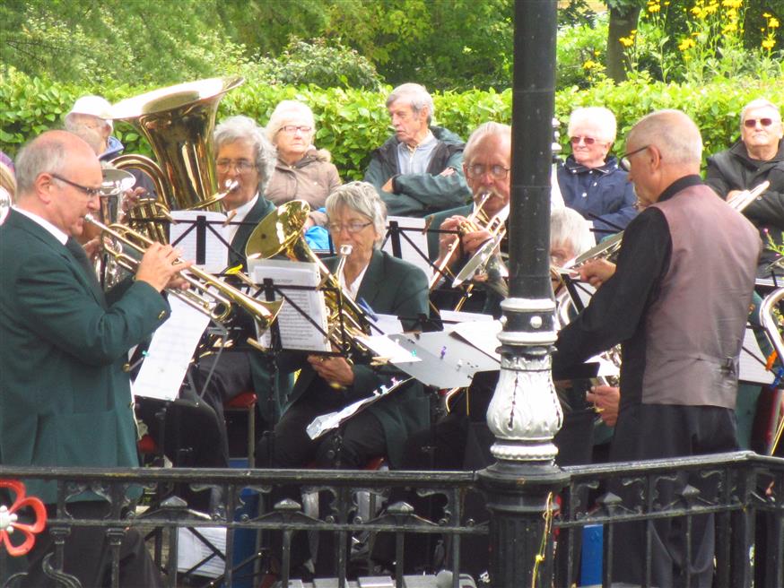 The bandstand. It was very windy this afternoon, with black clouds, so there was a discussion whether to move to the alternative inside venue. Thankfully the decision was to stay and play here.