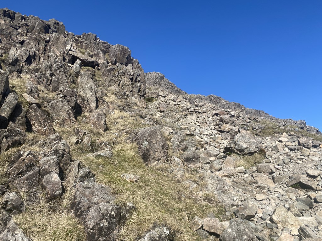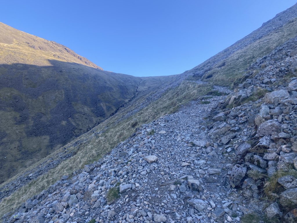 There is a 50m section of scree that is very unstable underfoot, so it is two steps forward and one slide back.