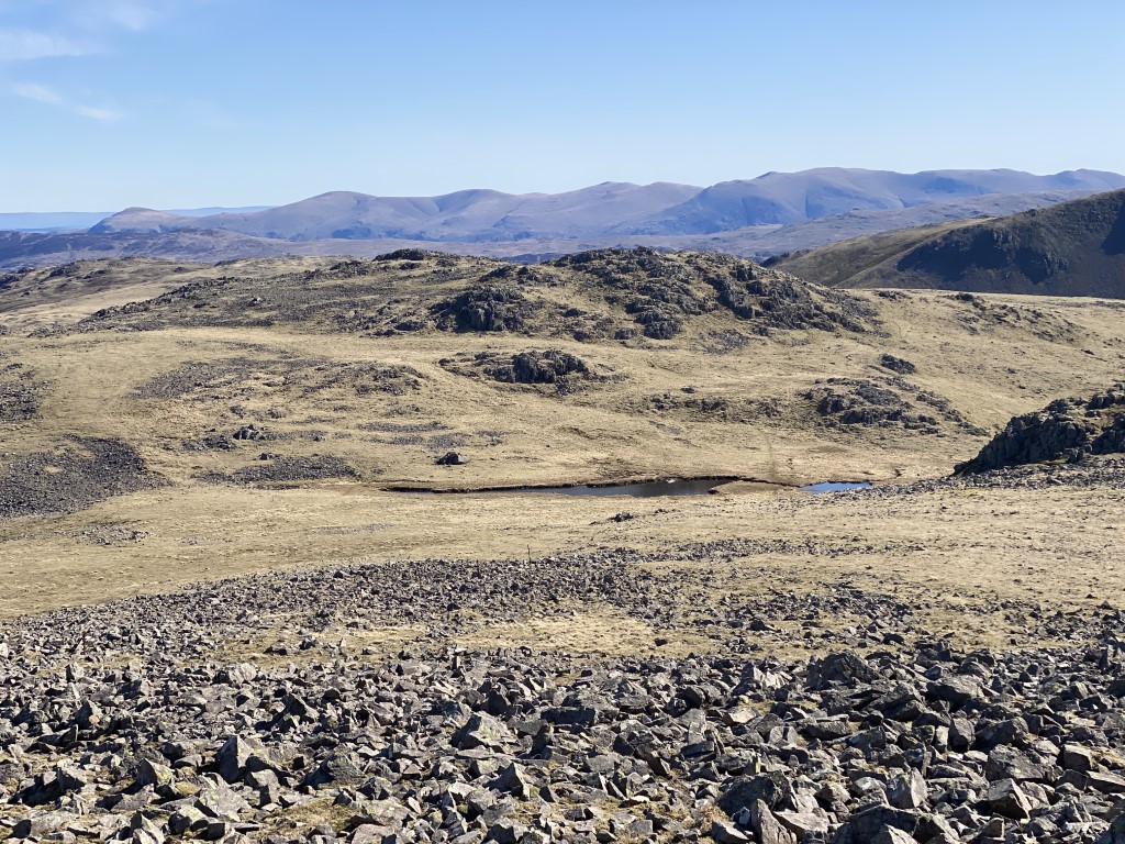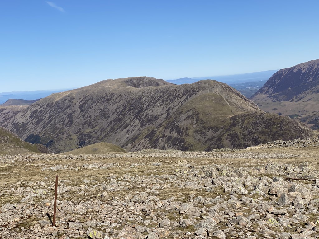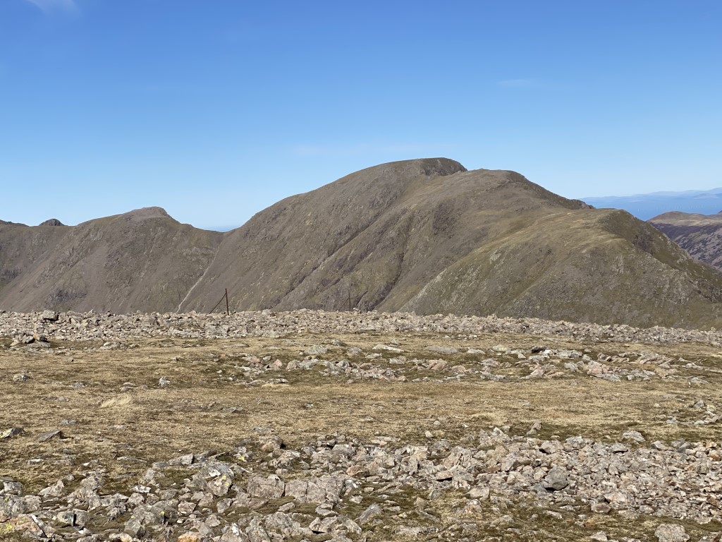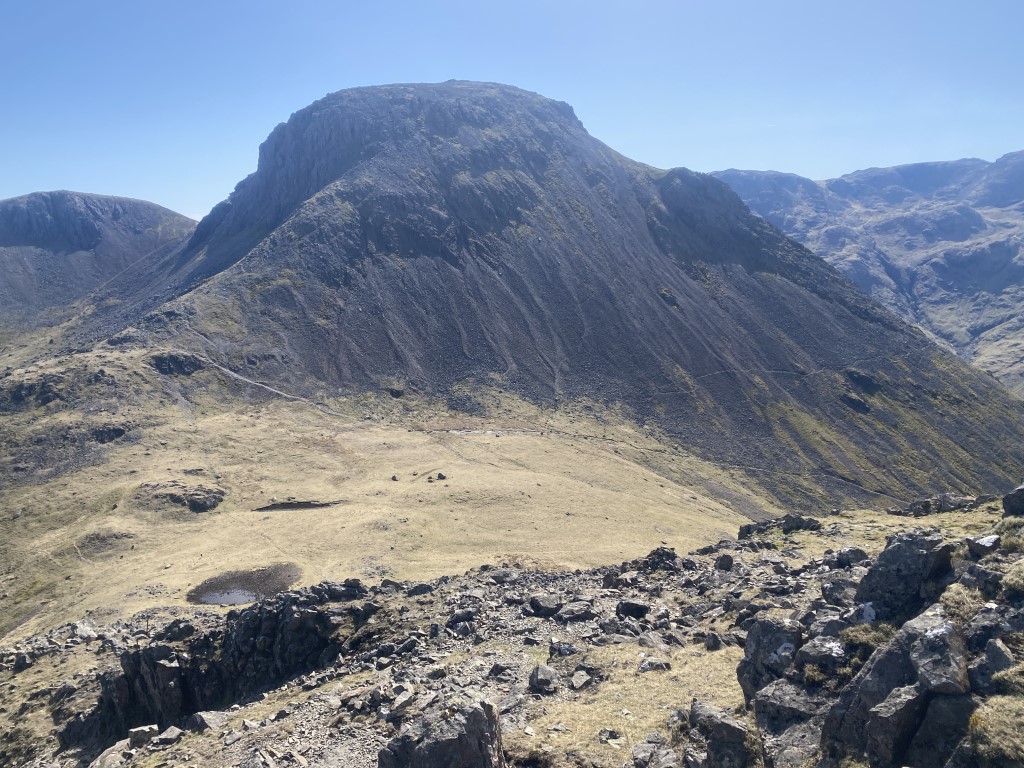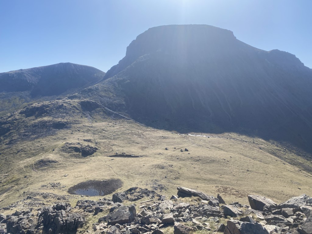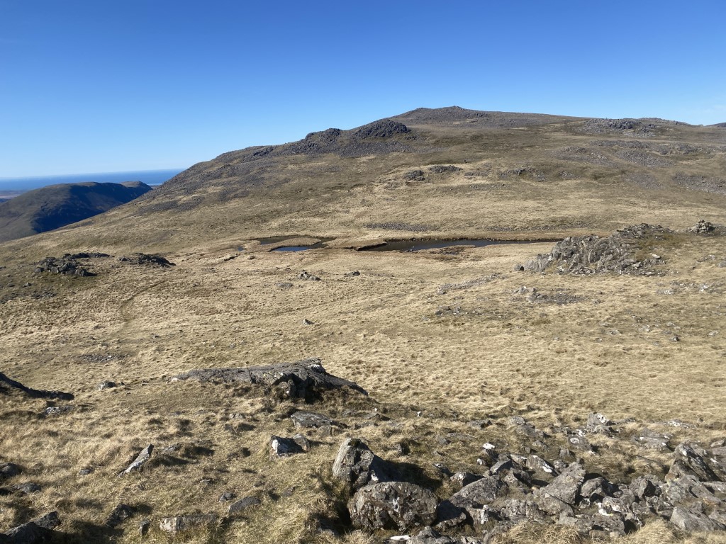 View of the main summit from the minor rock summit. There is always the disappointment that you have to descend to the tarns before climbing back up to the main summit.