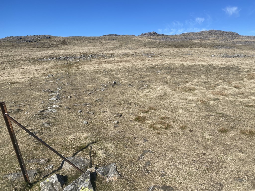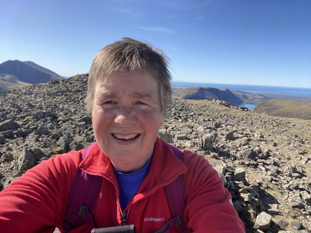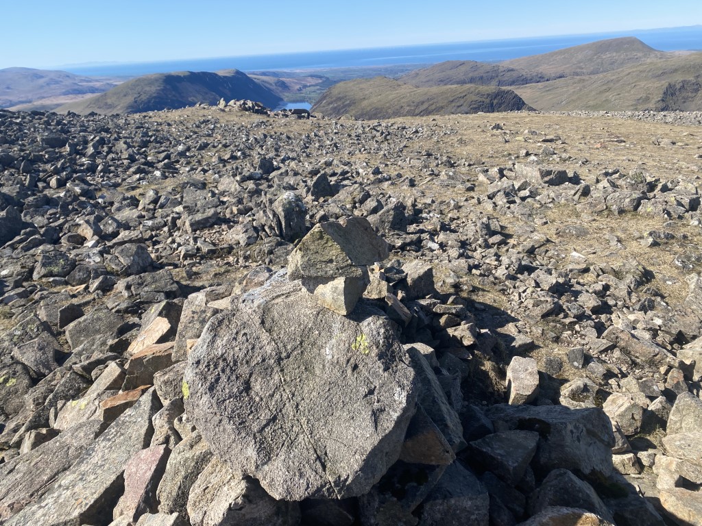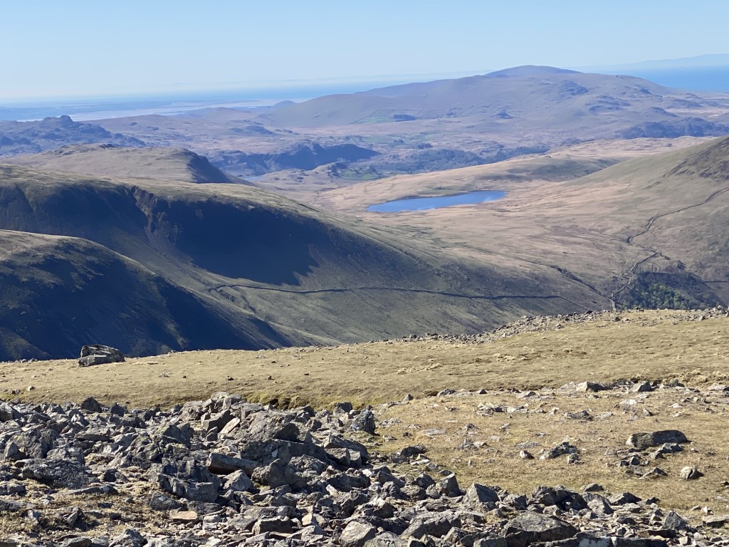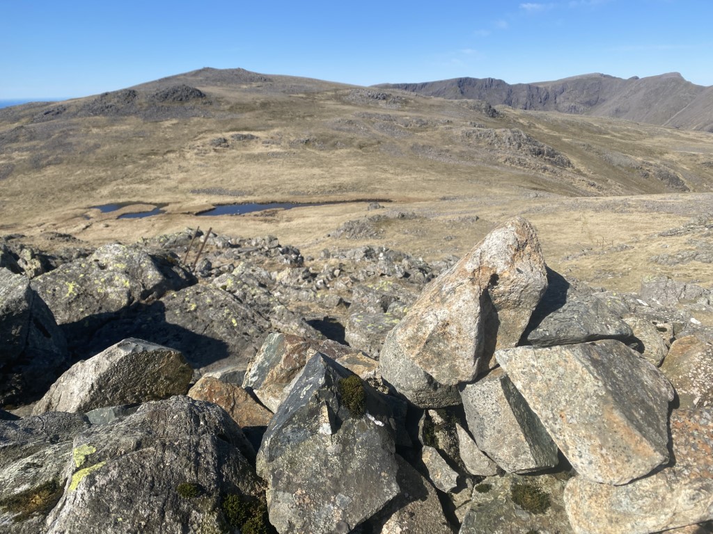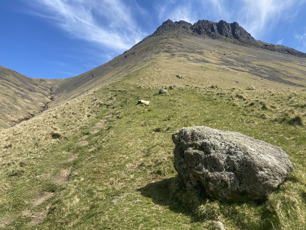 View of the main summit from the minor rock summit. There is always the disappointment that you have to descend to the tarns before climbing back up to the main summit.