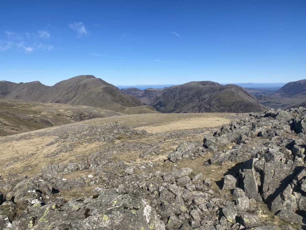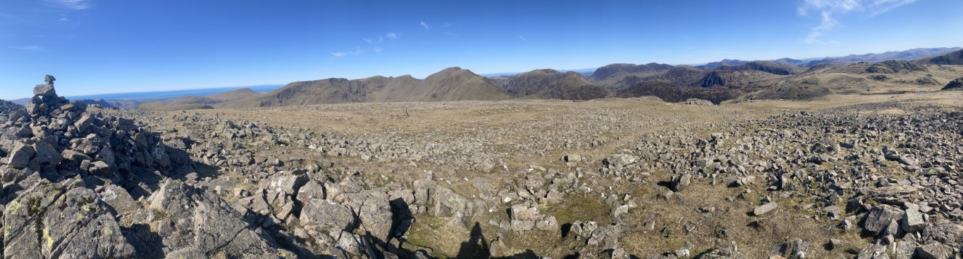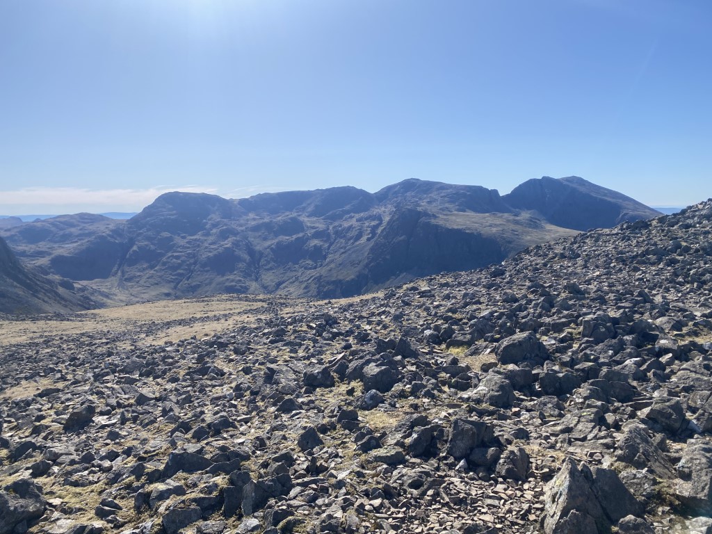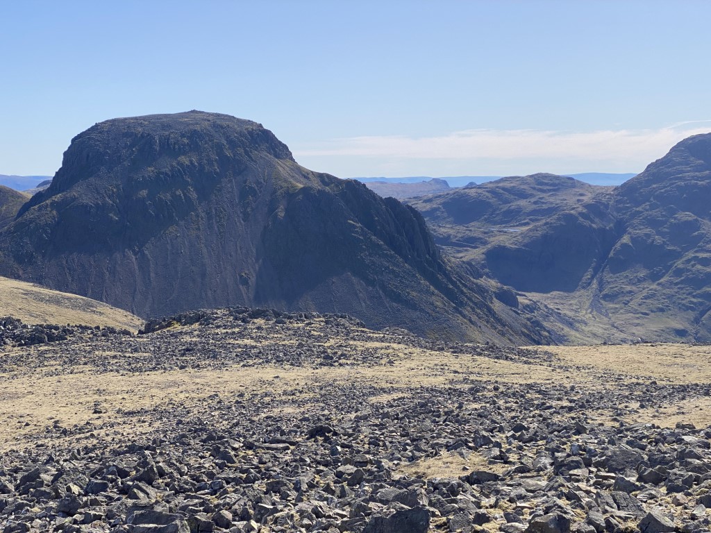 Great Gable, Harrison Stickle, Allen Crags and Sty Head Tarn with Great End right.